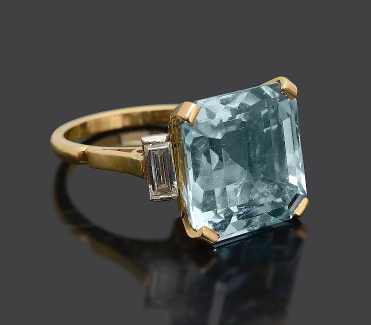 An aquamarine and diamond baguette dress ring