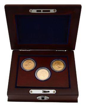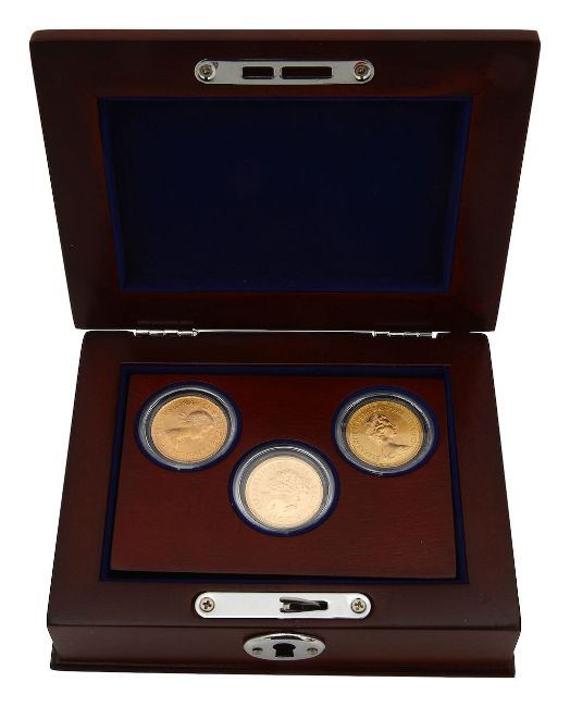 Set of 3 sovereigns, each representing one of the three major portrait-types features on circulation-quality sovereigns minted during the reign of QEII: the Gillick portrait dated 1965, the Machin portrait dated 1974 and the Rank-Broadly portrait dated 2000, reverses on all; St George slaying the dragon, all in capsule and box with certificate of authenticity.