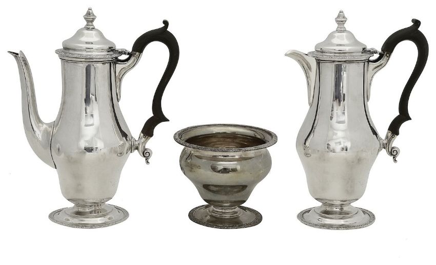 of ogee baluster form with tooled rims, on spreading circular feet, the coffee pot and hot water jug with hinged covers and ebonised scroll handles (3)