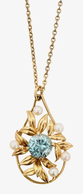 with 9ct hallmark to drop pendant and centrally set round blue zircon with five seed pearls set to gold leaf on a tear drop border