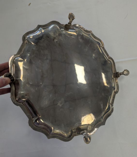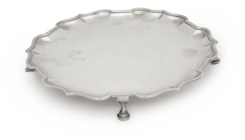 An Edward VII silver piecrust salverLondon, 1908, C.S. Harris & Sons Ltd.serpentine shaped rim, plain field, all raised on four hoof feetdiameter 35cm, weight approx. 36.50oztCondition: Light tarnishing and surface scratches. The hallmarks are clear and legible. No dents or repairs.