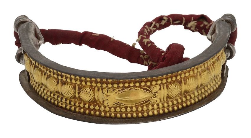 a rigid metal curved band with a central golden panel featuring a repoussé geometric and foliate design, bordered by raised beadwork decoration, the reverse bears an incised or punched inscription, with terminals fitted with red textile ties