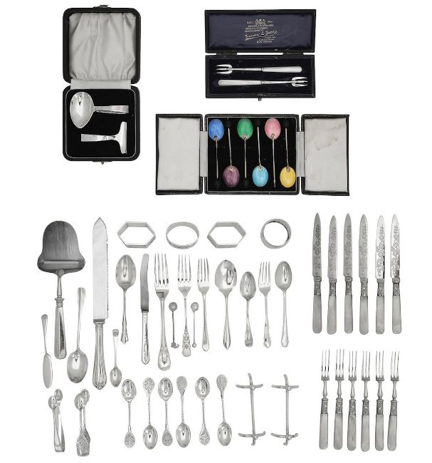 A collection of silver and plated wares, flatware, napkin rings etc.