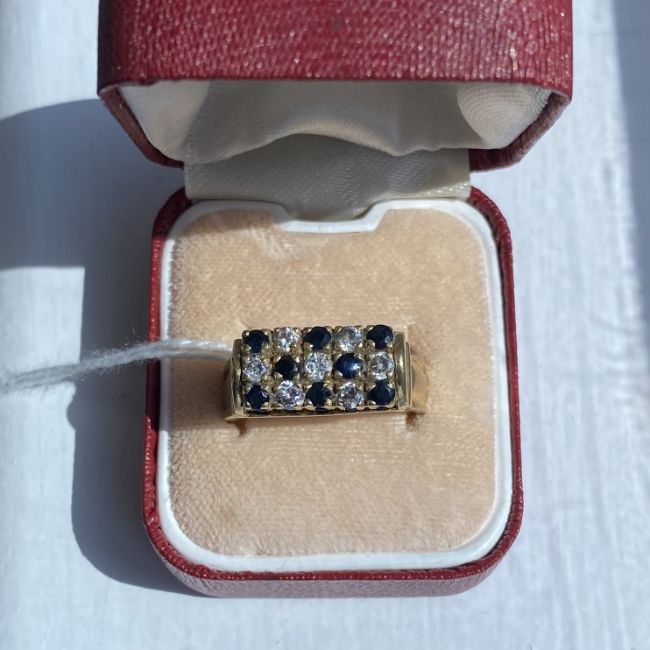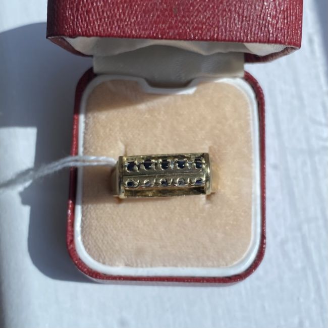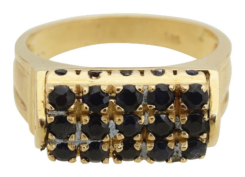 with 585 stamp, three row reversible head dress ring with differing three rows of gem stone design to each side.