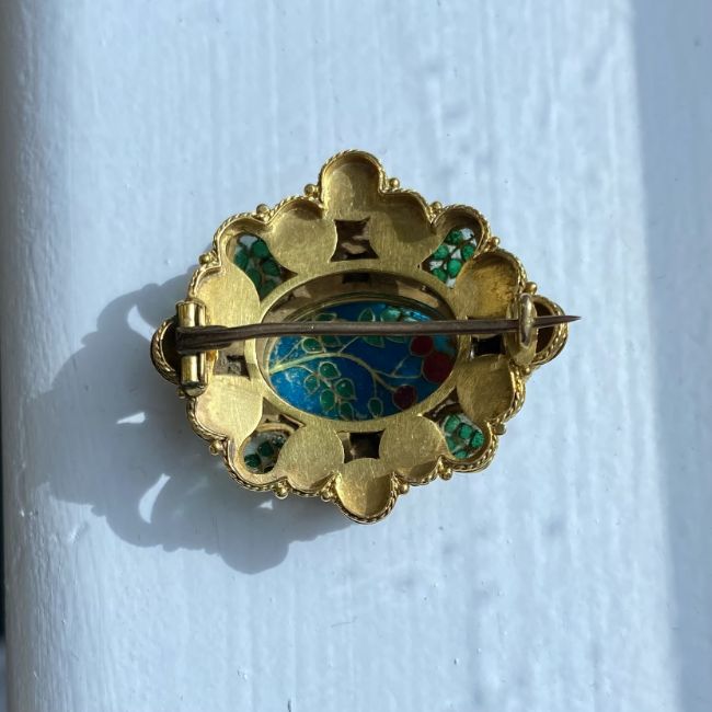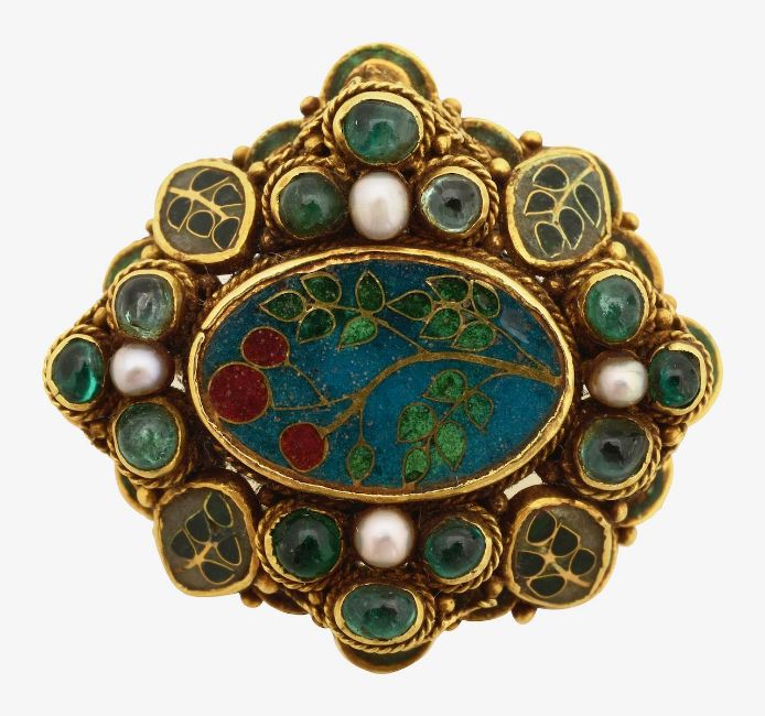 the raised oval openwork and wirework yellow gold brooch comprising champlevé polychrome floral and foliate panels and with cabochon emerald rub over collets and half pearls clusters to the cardinal points