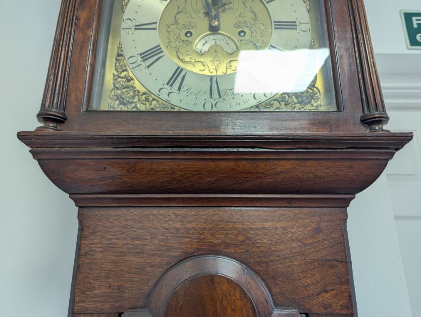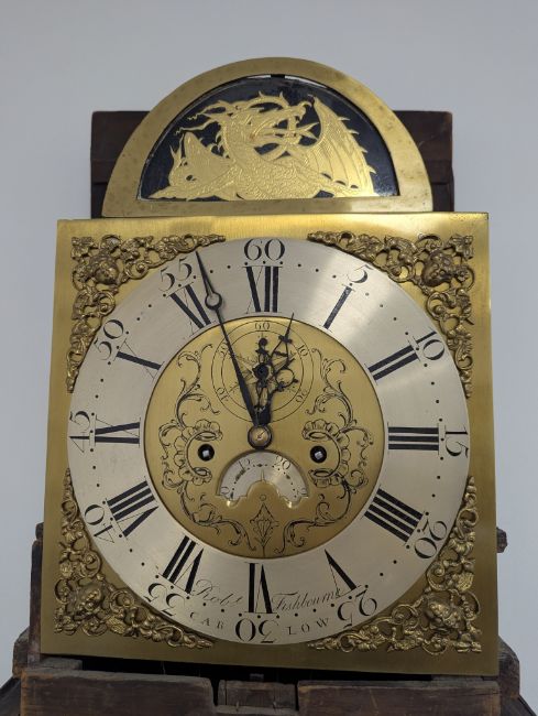 13 1/2-inch dial with winged cherub spandrels, signed Robt Fishbourne, Carlow, engraved centre with subsidiary seconds dial and date aperture, the later arch decorated with a dragon, rack and bell striking movement, the associated case with swan neck cresting, fluted hood pillars, broken-arch trunk door and rebuilt panelled plinth.