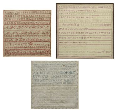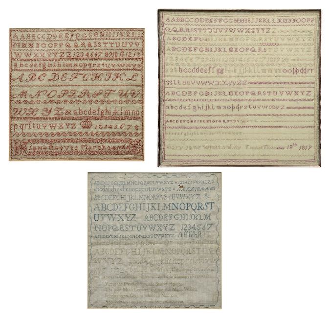 A group of three needlework samplers,comprising an example by Jane Reeves, March 24th 1864, another by Mary Jane Winstanley, December 18th 1819, and an earlier green thread example, all with alphabet lines (3)Jane Reeves) 28.5 x 28.5cm, framed and glazed 38 x 37cmMary Jane) 32.5 x 32cm, framed and glazed 36 x 36cmGreen thread) 30 x 29cm, framed and glazed 42 x 40.5cmCondition: Jane Reeves) Thinning areas and fraying, particularly to the edges. Mary Jane Winstanley) Historic repair to the W. No visible holes. Green thread) Holes to the top and staining. Provenance: From a single-owner private collection.