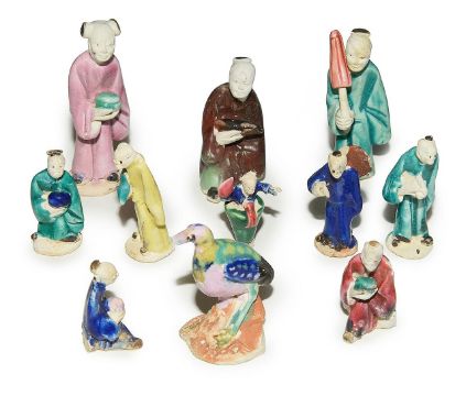 early to mid 20th century, mudman style, including men and women, dressed in robes, holding various precious objects and a crane, in polychrome glaze (11)