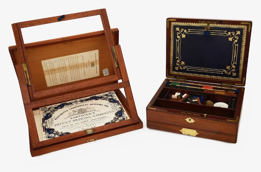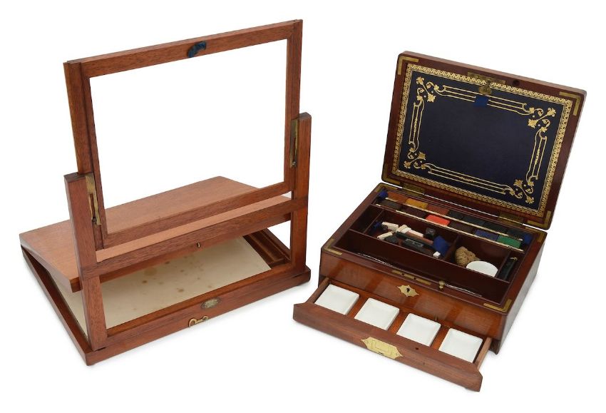 Condition: Ackermann box) Crack to the top. Losses to the paints. Cracks and crazing to the pottery palettes. No key present but the drawers open. Lorimer's drawing apparatus) Foxing and stains to the papers. Some knocks and wear to the case and easel.