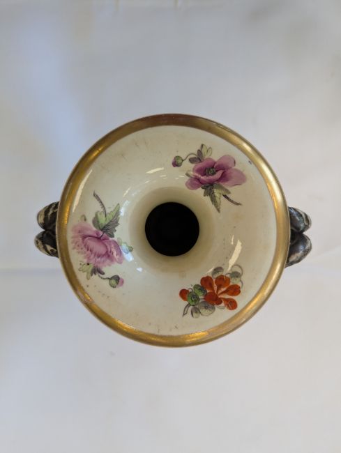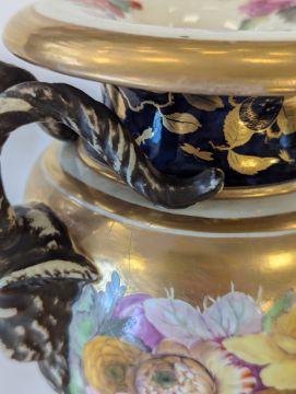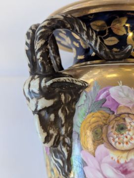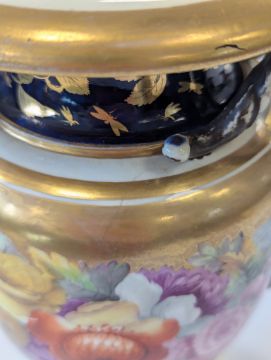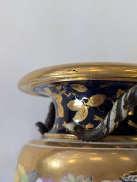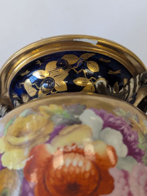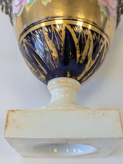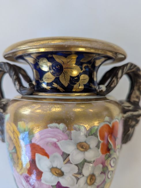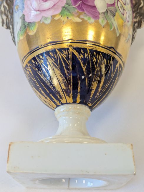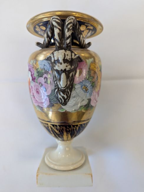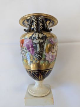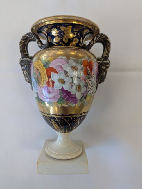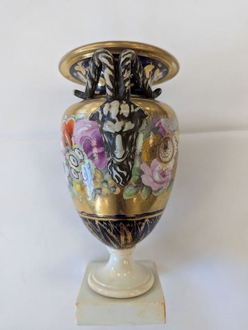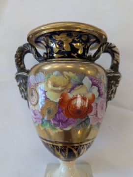 A Miles Mason porcelain twin-handled vase,early 19th century, the handles modelled as ram's heads, the body with an elaborate floral frieze to a gilt ground, and mazarine blue borders, heavily gilt embellished with flowers and lappets, raised on a square white plinth base, impressed underneath 'M Mason'height 24cmCondition: Old hairline crack to square base, surface loss and crack to section of edge and underside of everted rim, approx. 3m length, otherwise general minor wear, commensurate with ageA Private Collection- Illustrated in Godden's 'Mason's China and the Ironstone Wares', see p.101