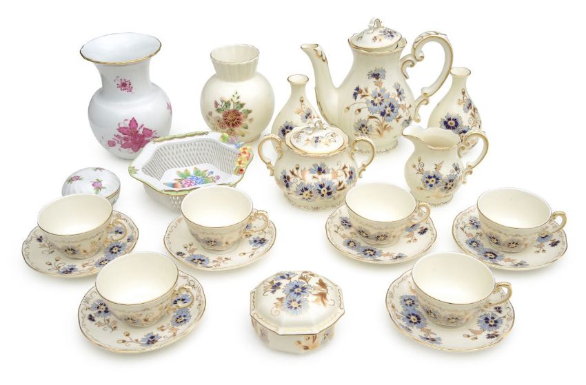 20th century, for six settings, floral decorated, gilt embellished, comprising six cups and saucers, a cream jug, sucrier and coffee pot; together with a small assortment of further Zsolnay Pecs and Herend wares (qty.)