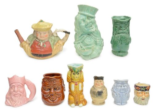 A group of nine pottery character jugs and teapots,