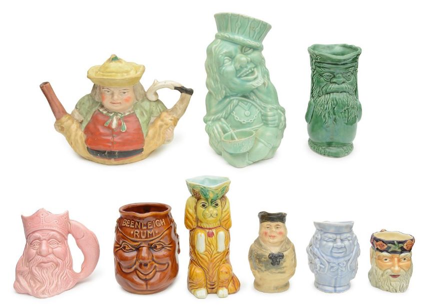 19th century, including a Staffordshire novelty teapot modelled as a peg-legged man, a majolica begging spaniel, a jug modelled as Neptune, and another inscribed 'Beenleigh Rum' (9)