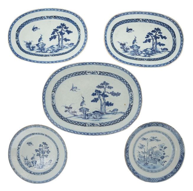possibly export, comprising three oval platters and two circular plates, each decorated in blue and with birds in a rural / river landscape, within floral and geometric borders, one circular plate with a differing scene of pagodas and bamboo (5)