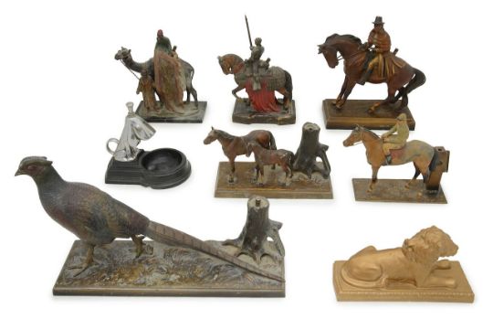 20th century, including after Franz Bergman, a painted spelter group of carpet sellers and camel, plinth base; together with a painted spelter Dick Turpin and Black Bess group; with various other horse and wildlife examples