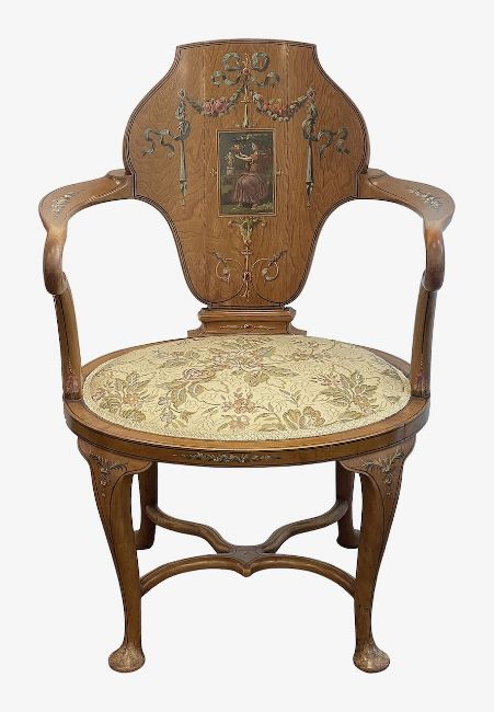shield-shape back with central Neo-Classical figural panel, within ribbon and swag field, scroll arms, upholstered oval seat, cabriole legs