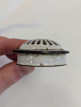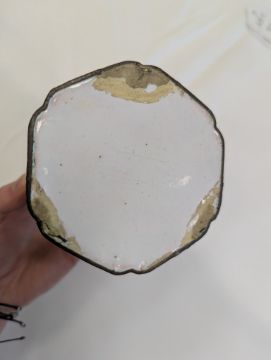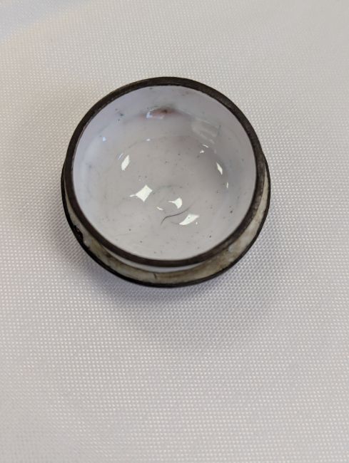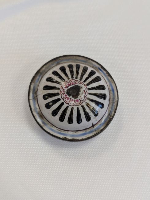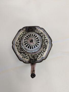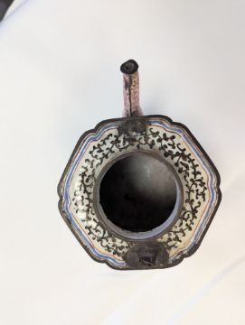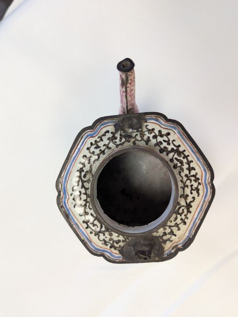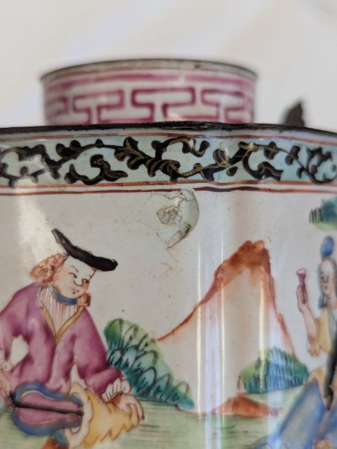 Condition: The handle and cover finial are missing. Cracks and losses to the enamel throughout. In need of attention.