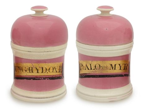 19th century, with gilt labels inscribed 'P:ALO et MYR' and 'UNG:HYD:OXR', to a pink ground, with domed covers (2)