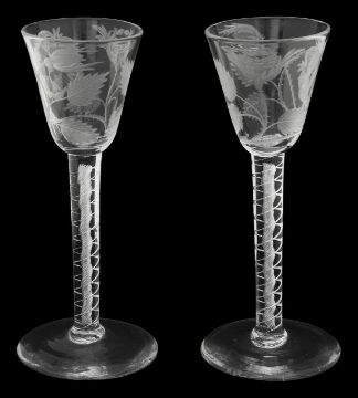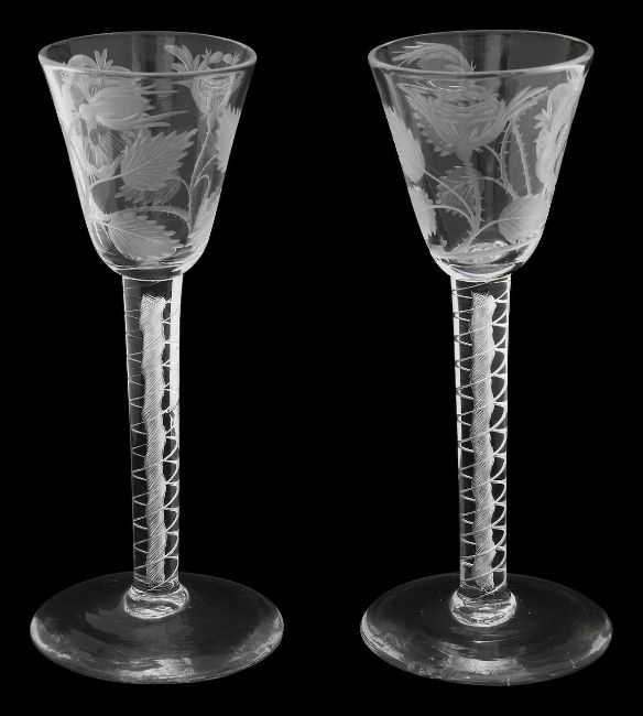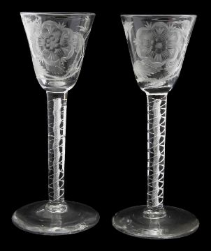 18th century, the round funnel bowl, engraved with a rose and closed bud, over a double series air twist stem, raised on a conical foot (2)