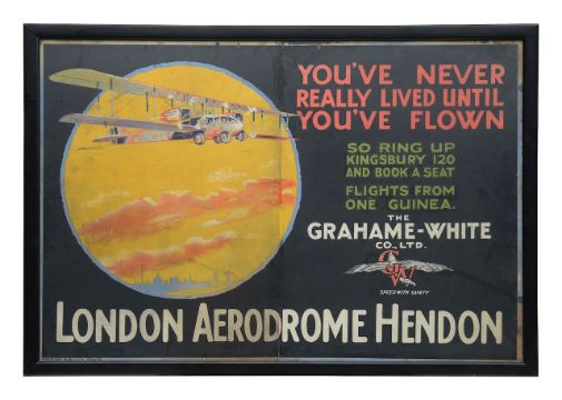 Vintage Poster: London Aerodrome Hendon'You've Never Really Lived Until You Have Flown.'The Graham-White co., ltd, Meerloo Publicity Service, printed on wove paper, framed, glazed and mountedOverall 43 x 64cm.Condition: Commensurate with age, wear and discolouration present, image retains vintage aesthetic. Unexamined out of frame.Note - To the best of our knowledge, we believe this to be a British aviation poster dating from the 1920s, advertising Grahame-White Aviation Co. Ltd. and flights from Hendon Aerodrome. The design, typography, and telephone number format all support an early 1920s origin, likely just after WWI when civilian pleasure flights were becoming popular. The condition—including period fading, matte surface, and foxing—strongly suggests it is an original lithographic print. With the printer’s credit “Meerloo Publicity Service” visible, this is likely a rare surviving example of early British aviation advertising.If you are in any doubt at all, we strongly suggest that you view this in person, as the above is not a statement of fact. This is our opinion, based on research undertaken to the best of our ability.