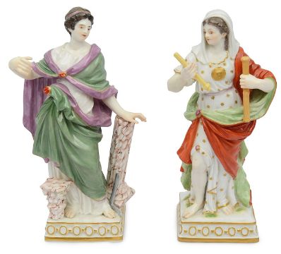 late 19th century, representing astronomy and architecture, from the Seven Sciences set, both modelled as classical ladies, square plinth bases, blue cross swords marks, (2)