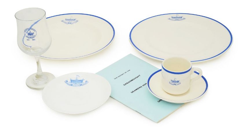 a teacup and saucer, a further saucer, a dinner plate and bowl, a drinking glass marked 'Seamen's Hospital Dreadnought, 1821-1986', and a booklet titled 'The History of The Dreadnought, Seamens Hospital at Greenwich' (7)