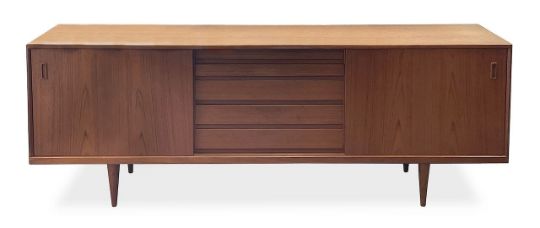 a teak sideboard, of rectangular form, central bank of five graduated drawers, flanked by twin shelved cupboards with sliding doors, all raised of turned tapered legs
