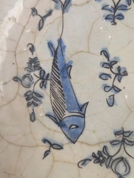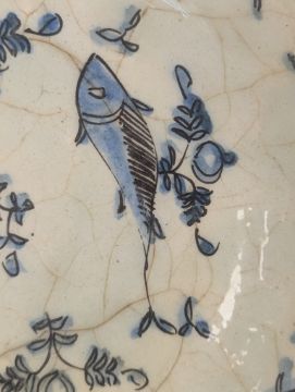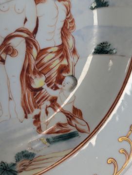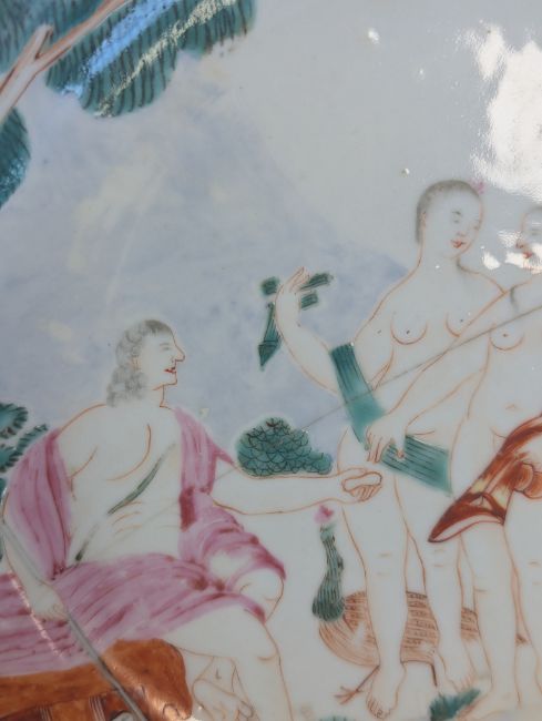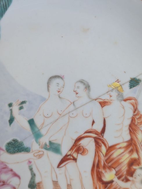 decorated in enamels with the Judgment of Paris, within gilt scrollwork border; together with a Persian crackle-glaze earthenware dish, probably 18th century, handpainted in blue with fish and foliage
