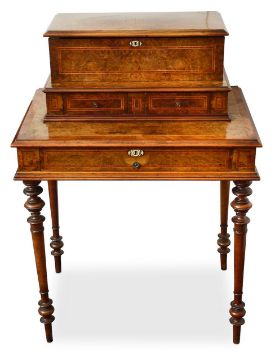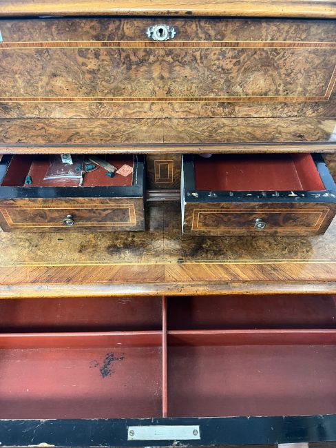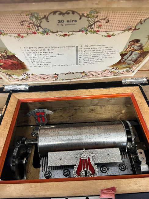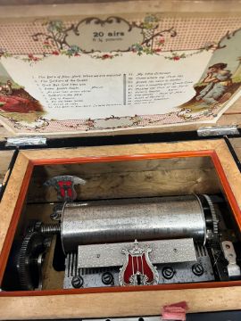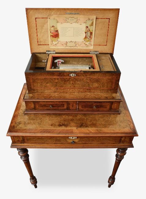 Condition: With no additional cylinders. In working condition. Sound appears to be good and clear. Pins appear to be in good condition and teeth on comb present. Glass cover to musical movement missing. The desk a little wobbly. Overall a good musical box with good sound although sadly missing additional cylinders.