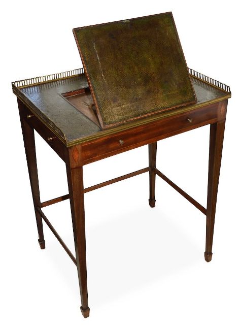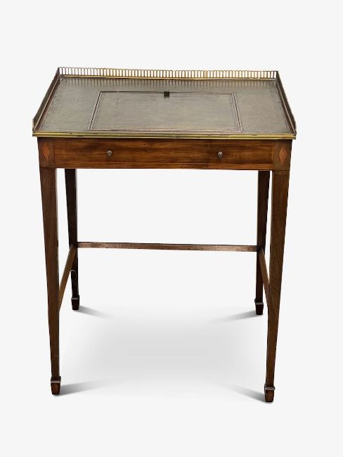 the brass galleried sides over a leather top with lift up reading slope, to a single compartment drawer, and two dummy drawers, raised on tapering supports united by a stretcher