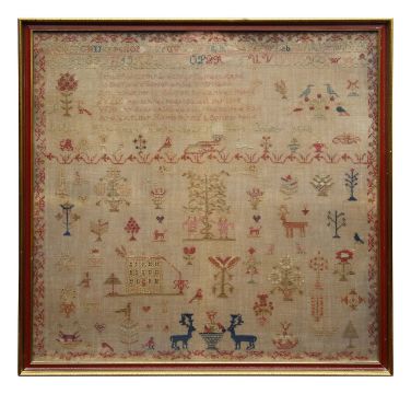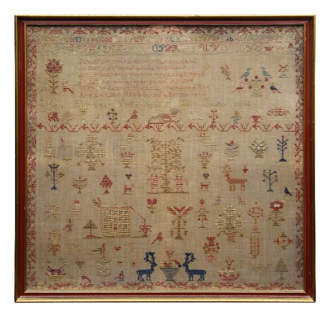 by Mary, aged 11, October 1848, silk on linen, with an alphabet, above a bible passage, to a depiction of Adam and Eve under the Tree of Knowledge, amongst deer, flowers and a Georgian house