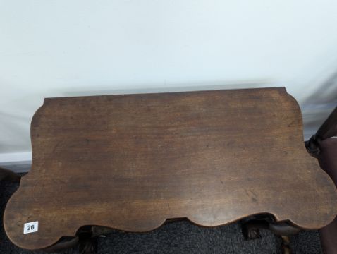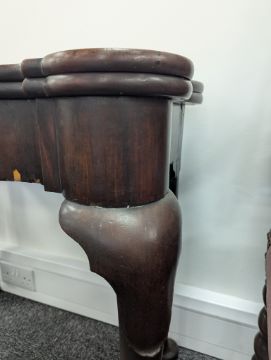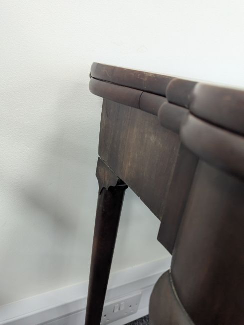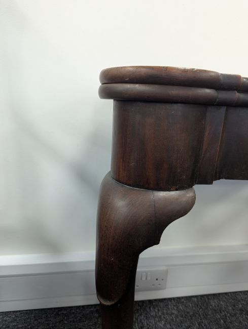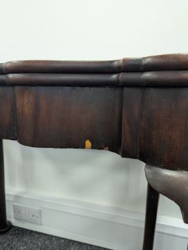 Condition: Repairs and restoration. Cracks to the rear supports. Crack to inner table top. Marks and scratches to the top. Loss to the veneer at the front.