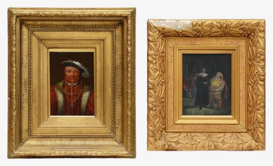 a pair of Tudor-themed works comprising an oil on board portrait of Henry VIII and a possible hand-finished print of a courtly interior scene, both unsigned and with gilt frames (2)