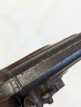 walnut stock and heavy overcoat, signed flat-top barrel and lock, swan neck cocks with sliding safe catches, engraved trigger guards, brass topped ramrods