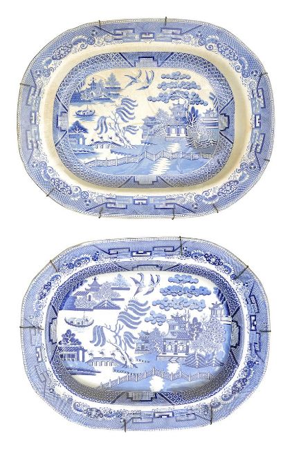 Two large 'Warranted Staffordshire' Willow pattern transfer printed meat dishes,