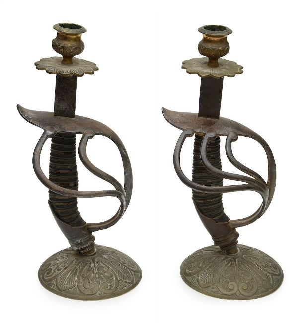 19th century and later, with brass sconces and drip-trays, raised upon cut-down blades, pierced hoop guards with leather and wirework entwined grips, domed brass bases with relief decoration