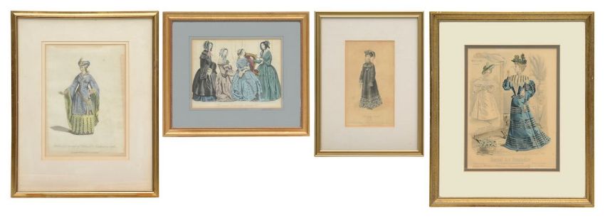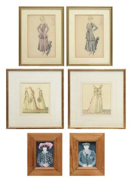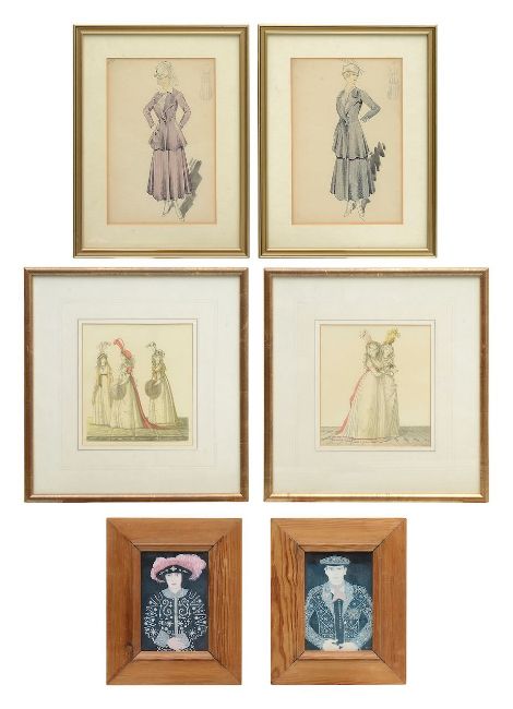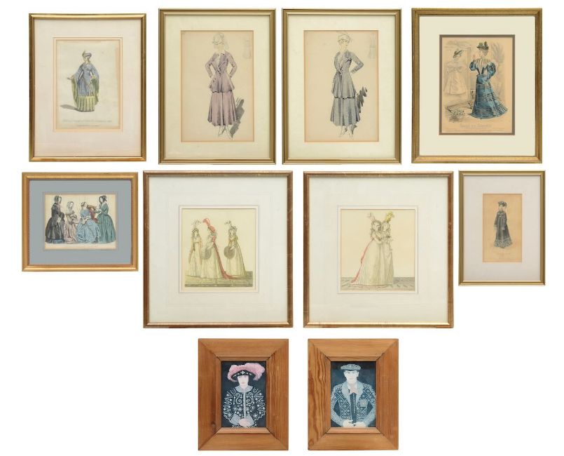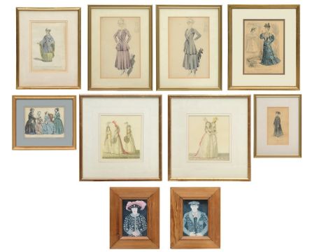 aquatints; Journal Des Demoiselles, et petit courrier des dames réunis,Modes de Paris, 1831, The newest Fashions for January, 1845, Habit of a Countefs of Holland & Zealand in 1200, etching; Morning Dress, British lady's mag. vol 1, plate 40, Dec 1817, all are mounted, with gilt frames, glazed, together with three pairs of costume studies; one pair of drawings, one of prints, both in formal historic costume, additional pearly King and Queen in naïve style, all framed, glazed and mounted (10)