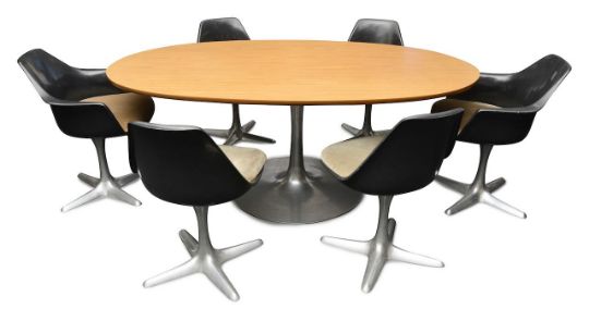 Maurice Burke (Canadian, 1921-2013) for Arkana,a set of six 'Tulip' chairs, comprising four singles and two armchairs, in black fibreglass, with pale upholstered pad seats, on aluminium cruciform bases, and a table, the simulated rosewood laminate top over an aluminium pedestal base (7)Table width 187cm, depth 108.5cm, height 73cm Chairs width 50cm, depth 38cm, height 79.5cm, seat height 45cmCondition: Table) Deep scratch to the top, lighter scratches to the base.Chairs) Marks and scuffs throughout. The upholstery is stained and in need of a cleanIMPORTANT NOTEWe do not provide any warranty or guarantee as to the safety of this item or the compliance with The Furniture and Furnishings (Fire) (Safety) Regulations 1988.For this reason, it should not be used in a private home or reupholstered, it is sold as a ‘work of art’.
