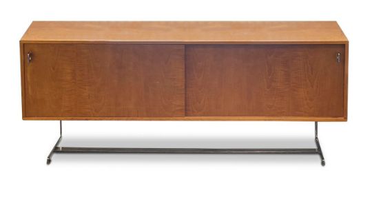 possibly by Richard Young, mid 20th century, the two sliding doors enclosing a fitted interior with two drawers and two glass shelves, with chrome handles and end supports, raised on a chrome base