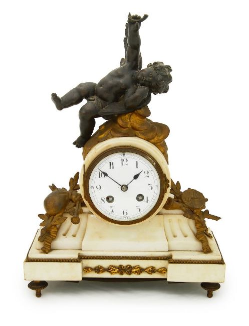 late 19th century, French, mounted with a spelter winged putto, above an enamel dial with Arabic numerals