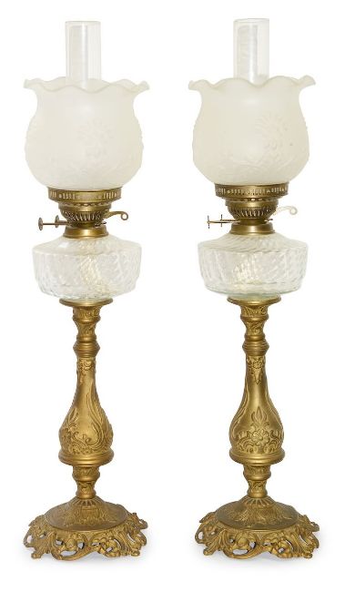 the central clear glass chimney, leading to a floral moulded opaque glass shade, above a facet cut reservoir, over a baluster form column, with floral decoration, raised on a foliate circular base (2)