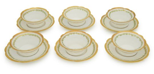 serpentine shaped rims, gilt embellished decoration, shallow conical bowls