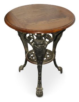 with a circular wood top, over three supports modelled as Britannia, raised on claw and ball feet