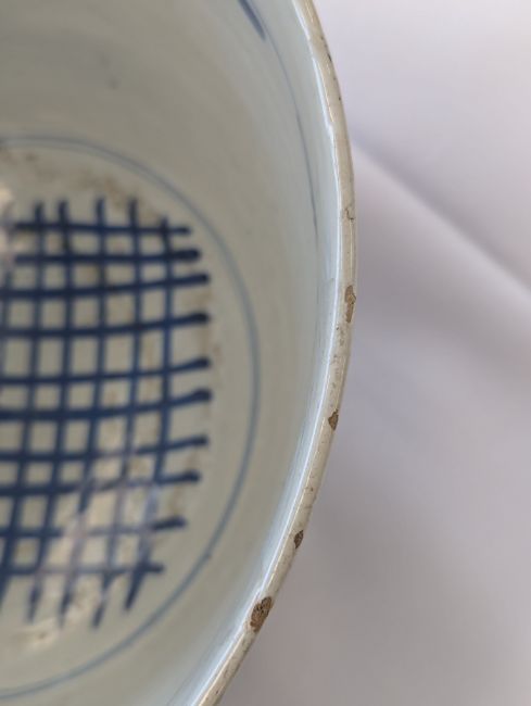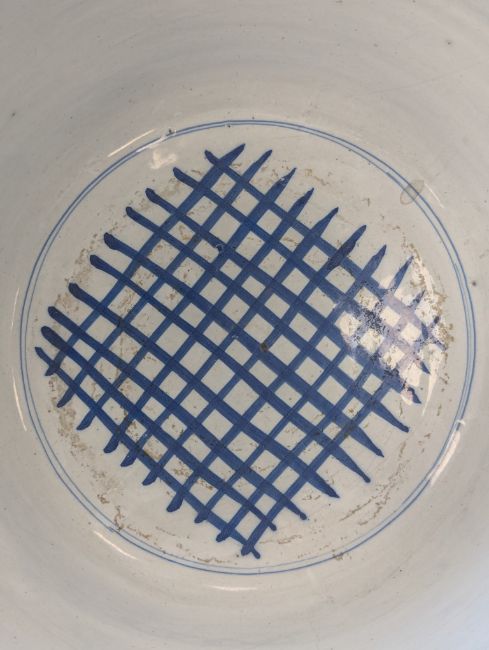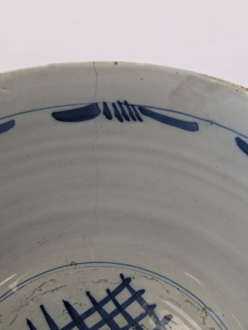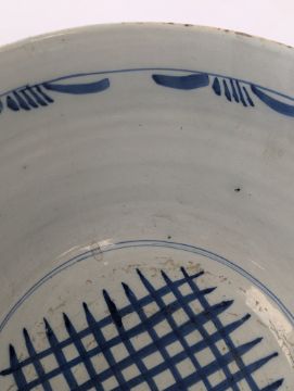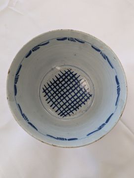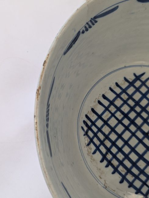 early to mid 18th century, with blue and red stylised foliate decoration with running scroll border, blue latticework to interior, footed base, mark to underside