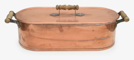 early 20th century, with turned wood handles, to a tinned interior with lift out stainer