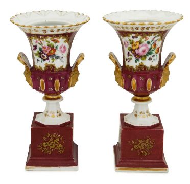 19th century, moulded with a band of bosses and twin mask gilt handles, decorated with raised gilt scroll framed reserved painted with polychrome floral bouquets against a claret ground, raised on square plinth bases, (2)