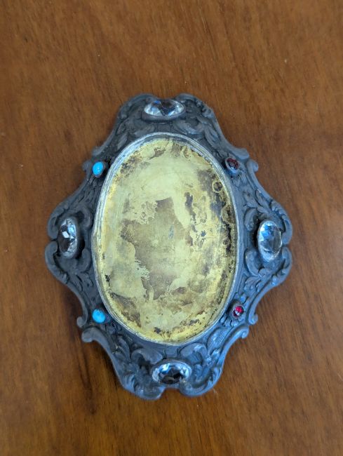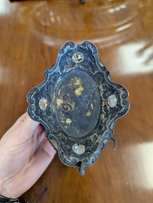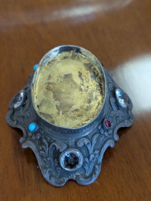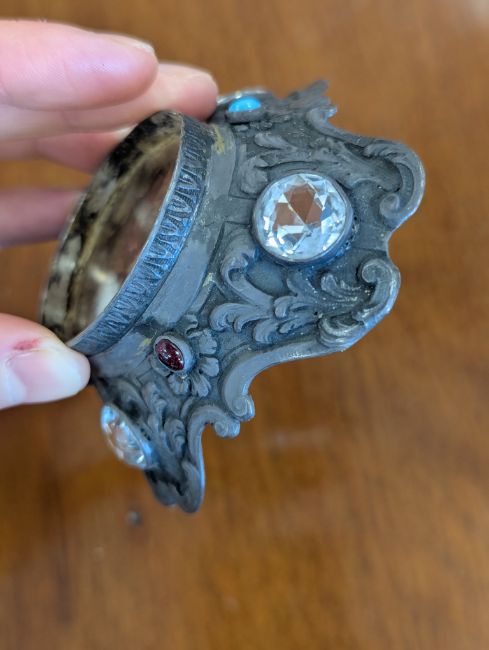 19th century, Continental, with base metal mounts modelled as St George and the dragon, the scrolled base mounted with clear and red paste stones