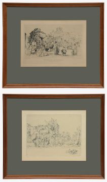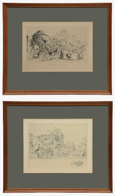 a pair of etchings, first; titled 'Assemblé en Camargue' with 'Chalcographie Du Louvre' printed below, to bottom left 'Gravure Originale', to bottom right 'D'Auguste Brouet', second; signed 'A.Brouet' and numbered 7/16 in pencil to the bottom right and left respectively, both framed, glazed and mounted