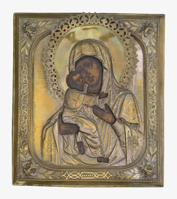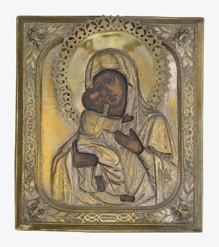 19th century, of the Madonna and Child, tempera on wood, in a gilt metal oklad, with an engraved inscription