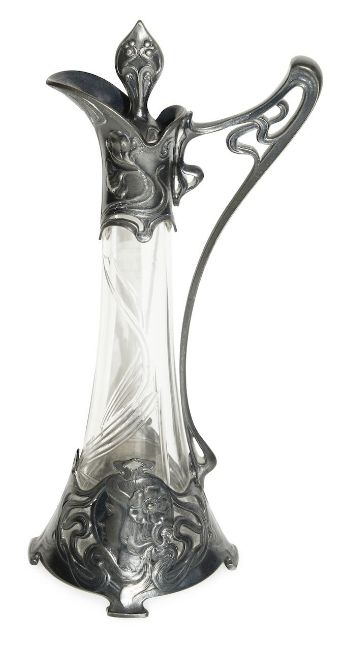 early 20th century, German, of slender tapering form, the engraved glass set within pewter mounts, the neck cast with stylised flowers, the base with maidens, stamped marks